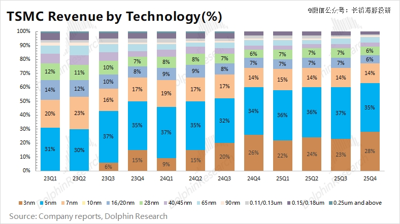 本季度7nm以下的收入占比维持在77%,先进制程领域是公司的核心收入来源。具体来看,本季度公司3nm收入占比为28%,5nm的收入占比维持在35%。当前公司的3nm和5nm产能都已经满产,公司2nm在2025年四季度开启初期量产,2026年实现大规模产能爬坡并贡献显著营收。