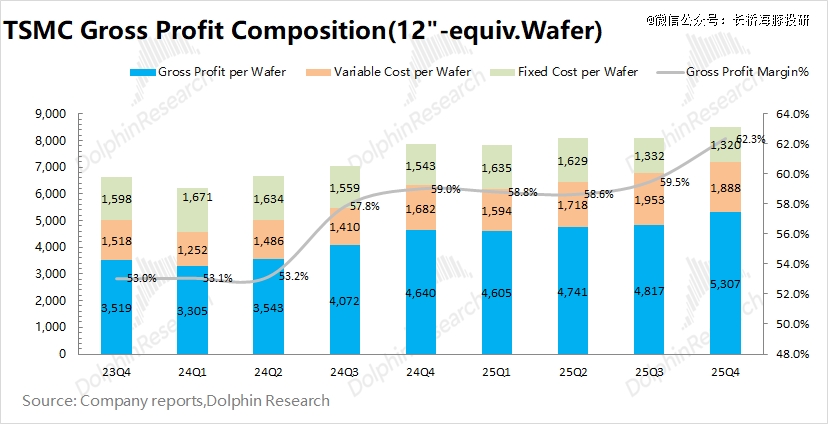 3)可变成本(其他制造费用):本季度台积电平均可变成本约1888美元/片,环比减少64美元/片。以台币口径看,单位可变成本基本持平,变动主要受美元升值影响。