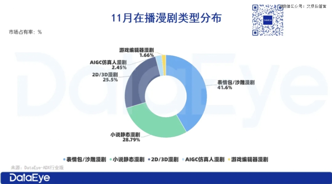 首先,下半年才开始爆发的漫剧,尚未真正攻入平台动漫的“核心腹地”。根据DataEye-ADX行业版数据,11月在播漫剧中,表情包/沙雕漫剧、小说静态漫剧占据70%,2D/3D漫剧仅占25.5%。这意味着目前漫剧只能作为用户打发碎片时间的“快餐”,暂时无法替代与用户一周一会的动漫“正餐”。