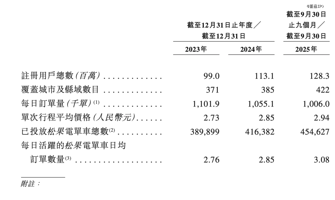 招股书显示,2023-2024年及2025年前三季度(下称:报告期),松果出行的每日订单量分别为110.19万、105.51万、100.60万单,呈下滑趋势;单次行程平均价格分别为2.73元、2.85元、2.94元,呈上涨趋势;每日活跃的松果电单车日均订单数量分别为2.76单、2.85单、3.08单,呈上涨趋势。在“越来越贵”、活跃电单车使用频次上升的同时,每日订单量这一指标却在下滑,或许是摆在松果面前不得不平衡的问题。