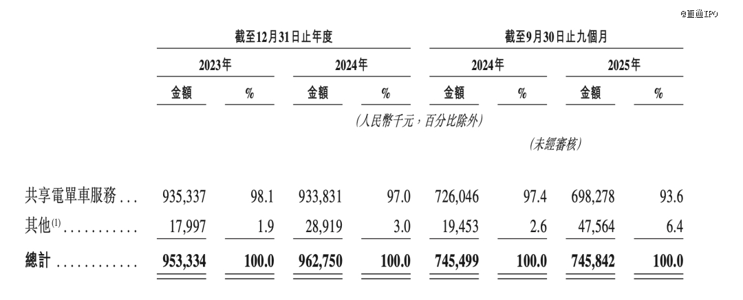 发展至今,松果出行的共享电单车服务是其商业模式的核心,报告期内,其来自共享电单车服务的收入分别约9.35亿、9.34亿、6.98亿元,占比分别高达98.1%、97.0%、93.6%。此外,该公司还提供平台服务以支持其运营合作伙伴,包括提供特定的IT基础设施支持及人工智能营运管理系统,透过松果出行应用程序提供广告服务,及向运营合作伙伴及客户销售电单车及备件,该部分收入分别约1799.7万、2891.9万、4756.4万元,占比呈逐年上涨趋势,分别为1.9%、3.0%、6.4%。