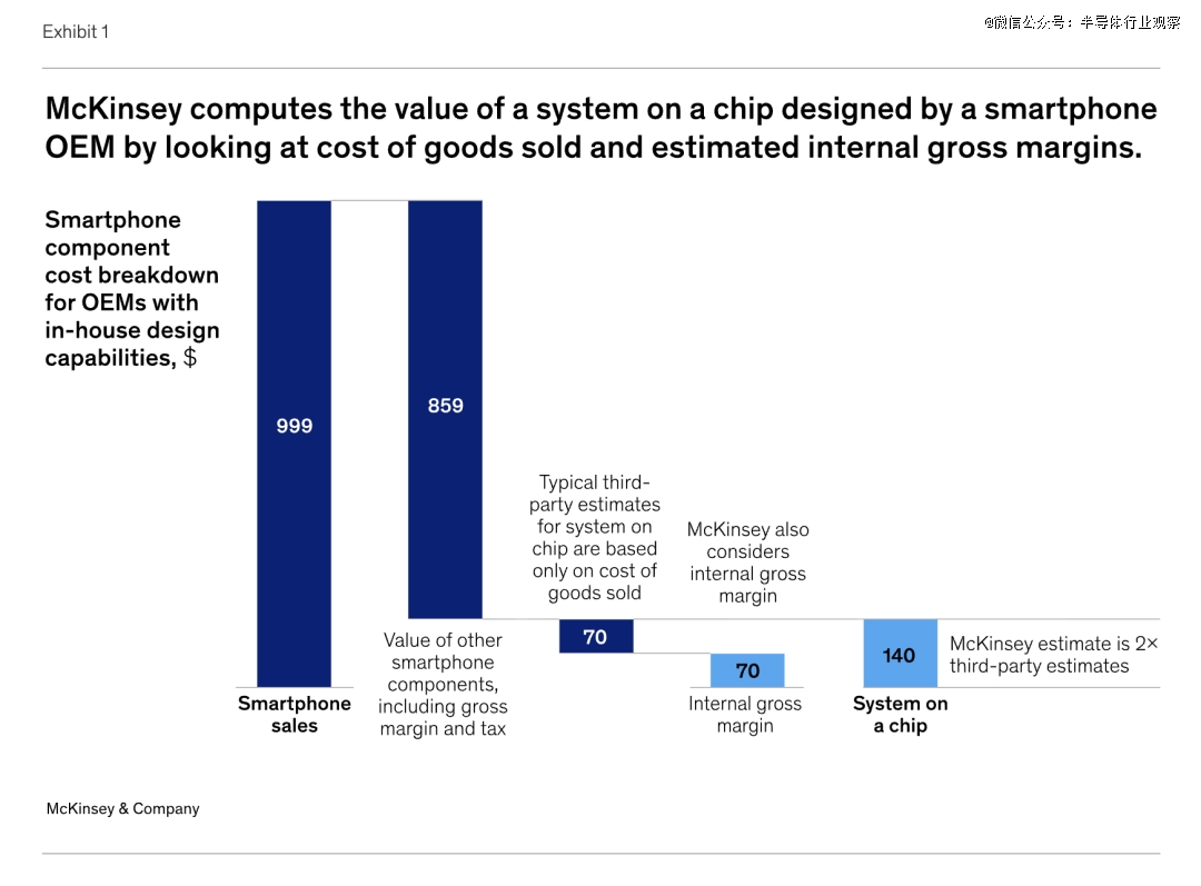 2、对于拥有自主设计的OEM厂商而言,大多数分析师仅通过考察销售成本(主要通过支付给代工厂的芯片制造费用)来评估自主设计的片上系统(SoC)的价值。这类分析忽略了预估的内部毛利率——即假设供应商向最终产品制造部门销售芯片所获得的利润——尽管在量化IDM厂商和无晶圆厂厂商的贡献时,这些毛利率已被纳入考量。我们的方法通过同时考虑拥有自主设计的OEM厂商的销售成本和预估的内部毛利率,确保了更高的分析一致性(见图表1)。
