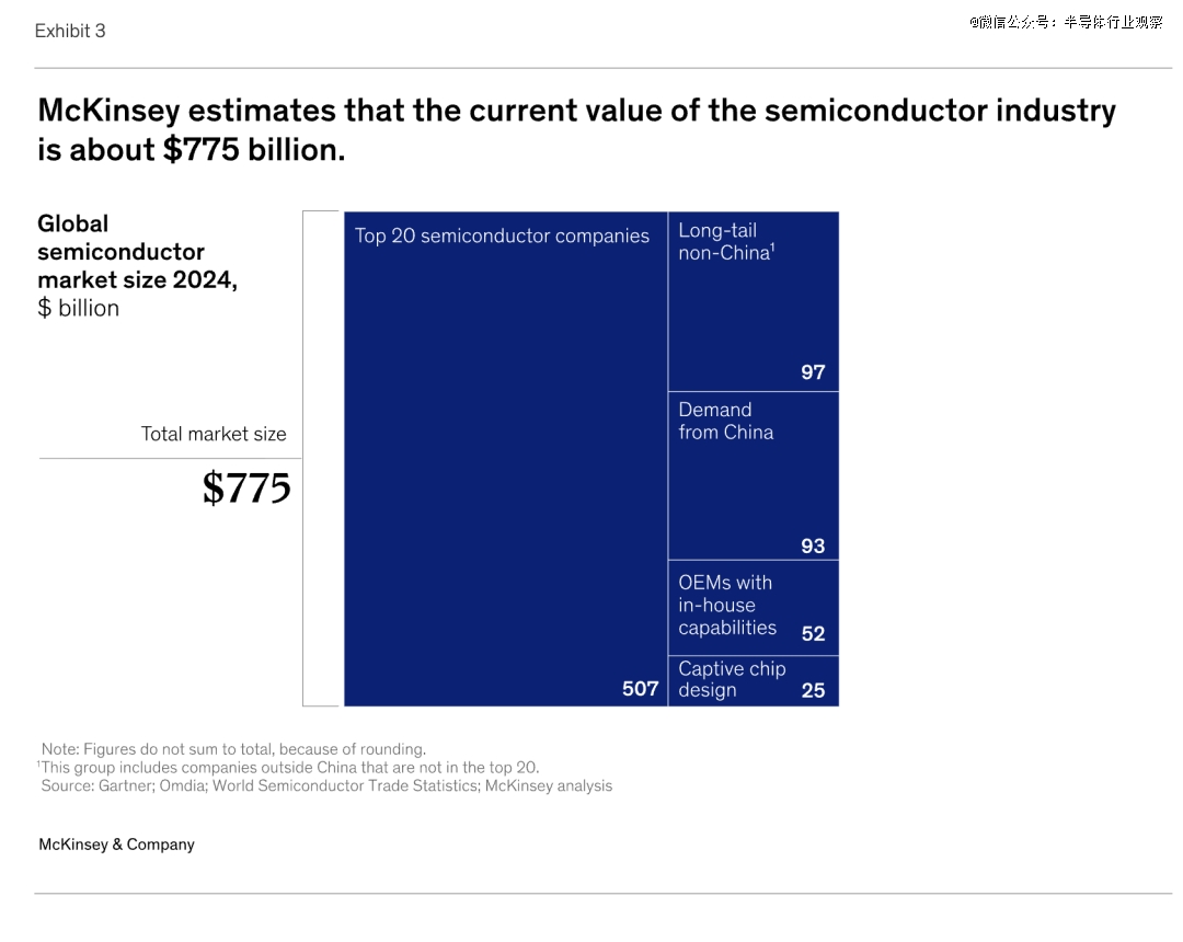 鉴于人工智能预计将推动半导体行业的平均复合年增长率远超2014年至2024年间9%的水平,准确的价值评估比以往任何时候都更加重要。为了更准确地评估半导体行业的价值,麦肯锡分析了所有类型的公司,包括中国的公司。我们没有依赖销售量(因为当公司不直接在市场上销售芯片时,销售量无法准确反映其价值),而是针对每类半导体公司进行了定制分析。例如,对于拥有自主芯片设计的OEM厂商(如智能手机制造商),我们根据其销售成本(COGS)结合产品的典型毛利率来估算其市场贡献。