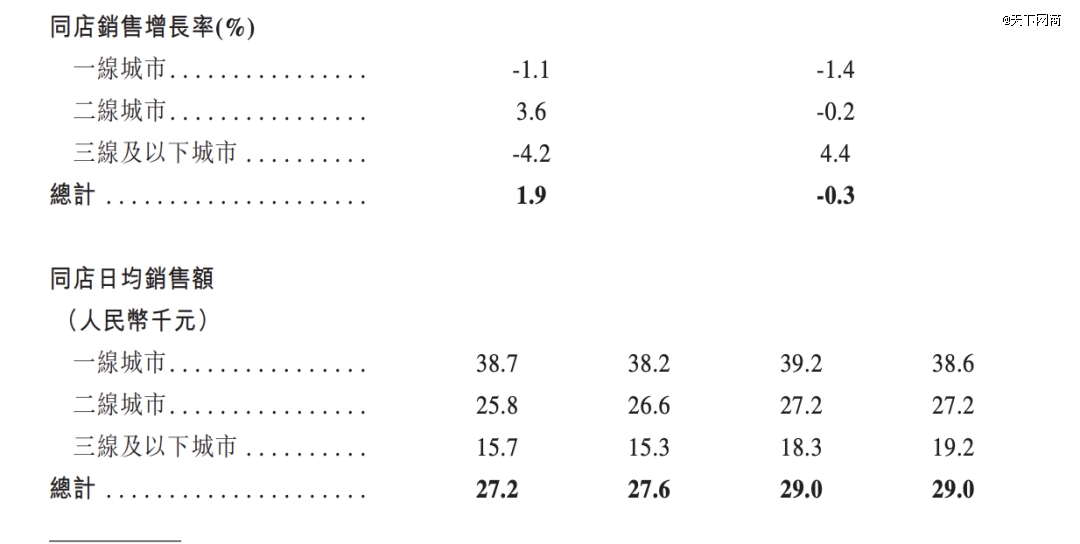 招股书显示,2024年及2025年前三季度,其一线城市门店的同店销售增长率已连续录得同比下滑,反倒是三线及以下城市保持正增长。