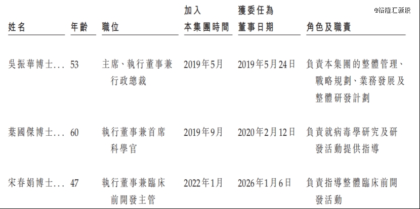 嘉因生物的执行董事有三名成员。其中吴振华博士今年53岁,目前任公司董事长、首席执行官兼执行董事。他先后获兰州大学细胞生物学学士学位、中国科学院上海细胞生物学研究所细胞生物学硕士学位、罗切斯特大学神经科学博士学位。