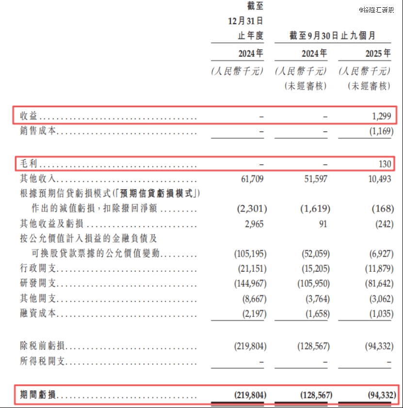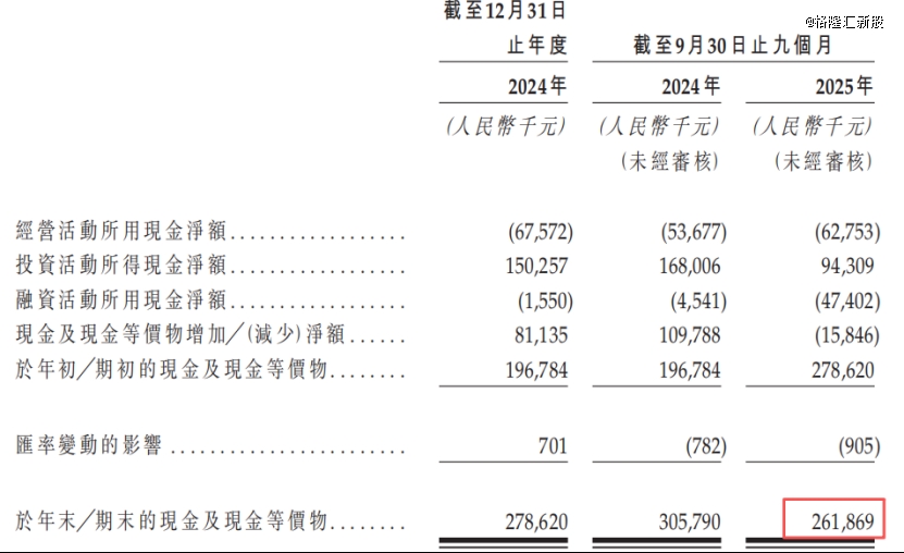 2024年及2025年1-9月(报告期),公司分别录得亏损2.2亿元、9433万元,研发开支分别为1.45亿元、8164.2万元,经营活动所用现金净额分别为6757.2万元、6275.3万元。