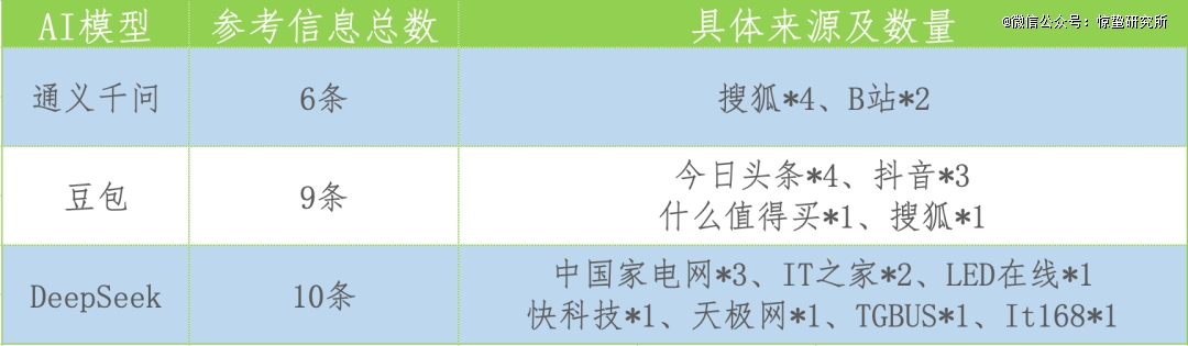 结果显示,通义千问参考了6条信息来源,其中4条来自搜狐,2条来自B站;豆包参考了9篇资料,4条来自今日头条,3条来自抖音,还有两条来自什么值得买和搜狐;DeepSeek的信源则更加复杂,参考的10条链接中,3条来自中国家电网,2条来自IT之家,其余5条链接则来自LED在线、快科技、天极网、TGBUS、It168。