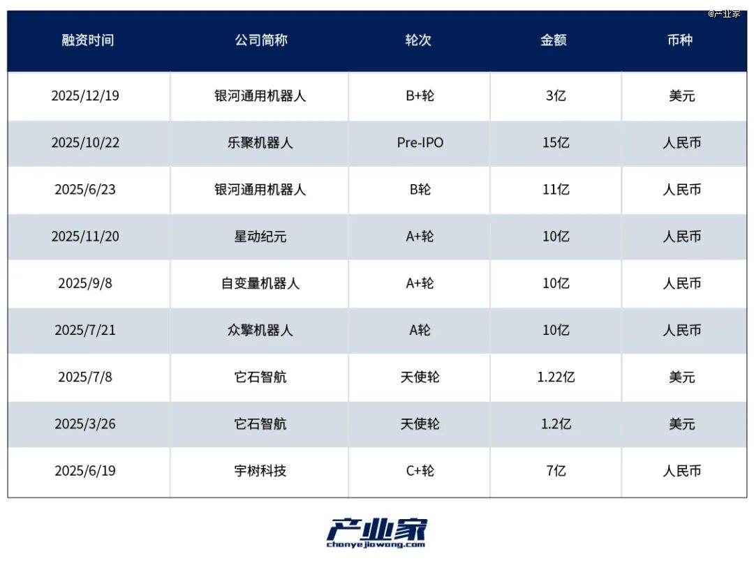 不过,却表现出的极强资金吸纳能力。例如12月19日,银河通用获得了3亿美元的B+轮融资;10.22日,乐聚机器人获得了15亿人民币的Pre-IPO融资;6月22日,星动纪元获得了10亿人民币的A+轮融资;9月8日,自变量机器人获得了10亿人民币的A+轮融资……
