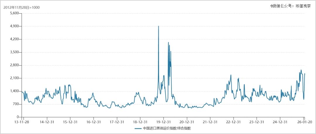 2025年7月底,中国进口原油运价指数触及880点的多年低位,随后市场呈现出“淡季不淡”的特征,并在传统旺季的四季度创下5年新高。此后虽有一定波折,但最新运价依然维持在相对高位。