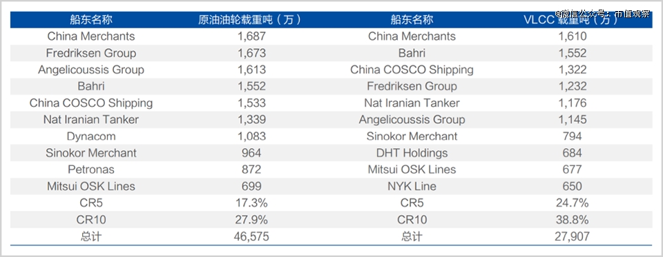 据克拉克森最新数据,按VLCC载重吨计算,招商轮船、中远海能分别以1610万吨和1322万吨位列全球第 一、第三,前十家公司市场占有率合计已接近40%。