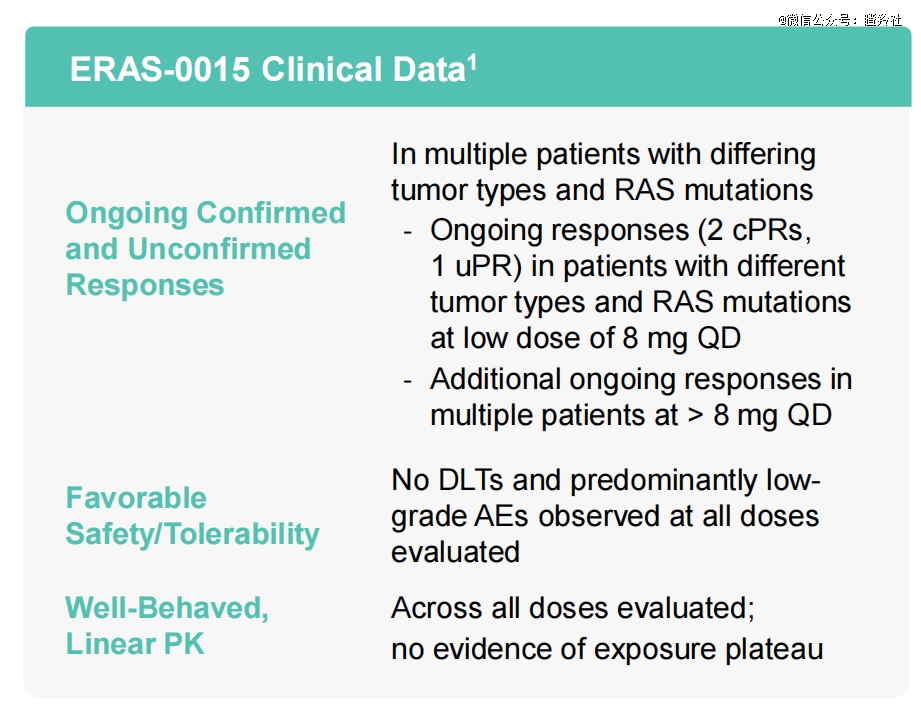 尽管完整的剂量队列并未公开,但公司已获准启动40mg剂量队列,展示出在基于安全性良好的背景下对ERAS-0015尽可能最 大的疗效开发。