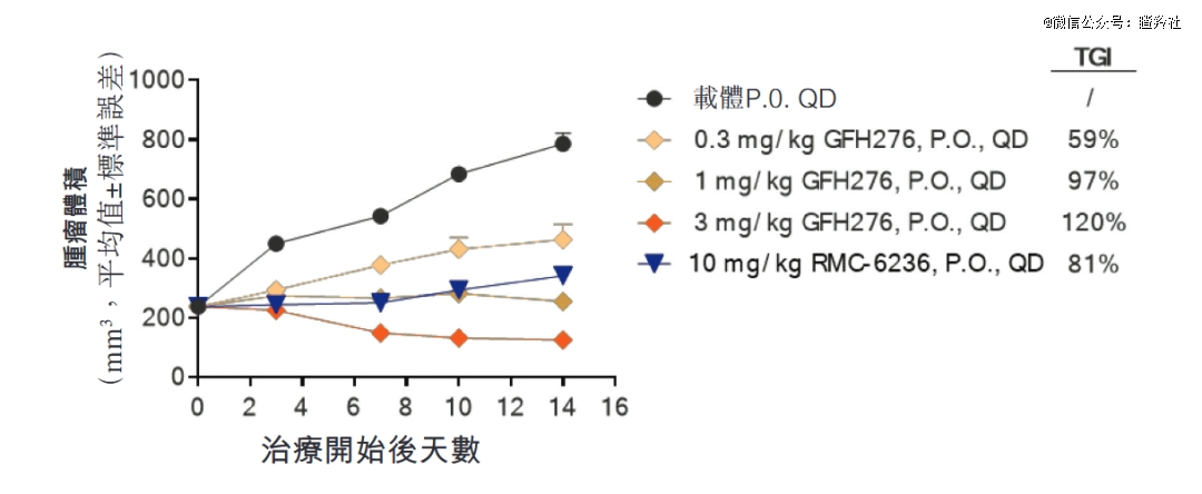 临床前数据显示:在携带多种KRAS突变(G12C、G12D、G12V、G13D等)的非小细胞肺癌、胰腺癌、结直肠癌动物模型中,相较于同周期RMC-6236口服给药10 mg/kg QD的实验动物,GFH276口服给药1或3 mg/kg QD的实验动物即可实现同等或更大的肿瘤消退。另外,GFH276的在动物体内的清除率显著低于Daraxonrasib,口服生物利用度则显著高于后者。