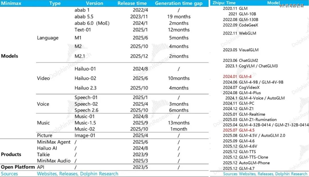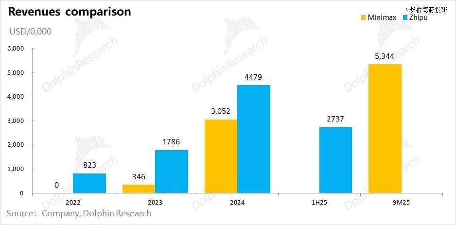 两个大模型公司Minimax和智谱,都是“短小精悍”型——人手少、产品迭代快,收入增长快。人数到2025年下半年没超一千人,收入零起步,两三年年化收入都在快速迈向一亿美金。
