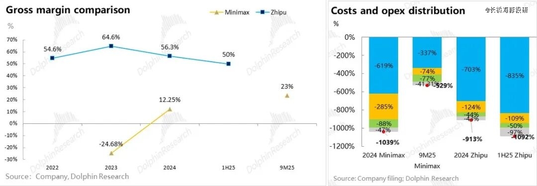 但到了支出层,再高增的收入都被凶猛的投入比得相形见绌:即使收入增长过程中,Model to B公司智谱持续保持在50%的高毛利,还是Model to C公司Minimax毛利率翻正。