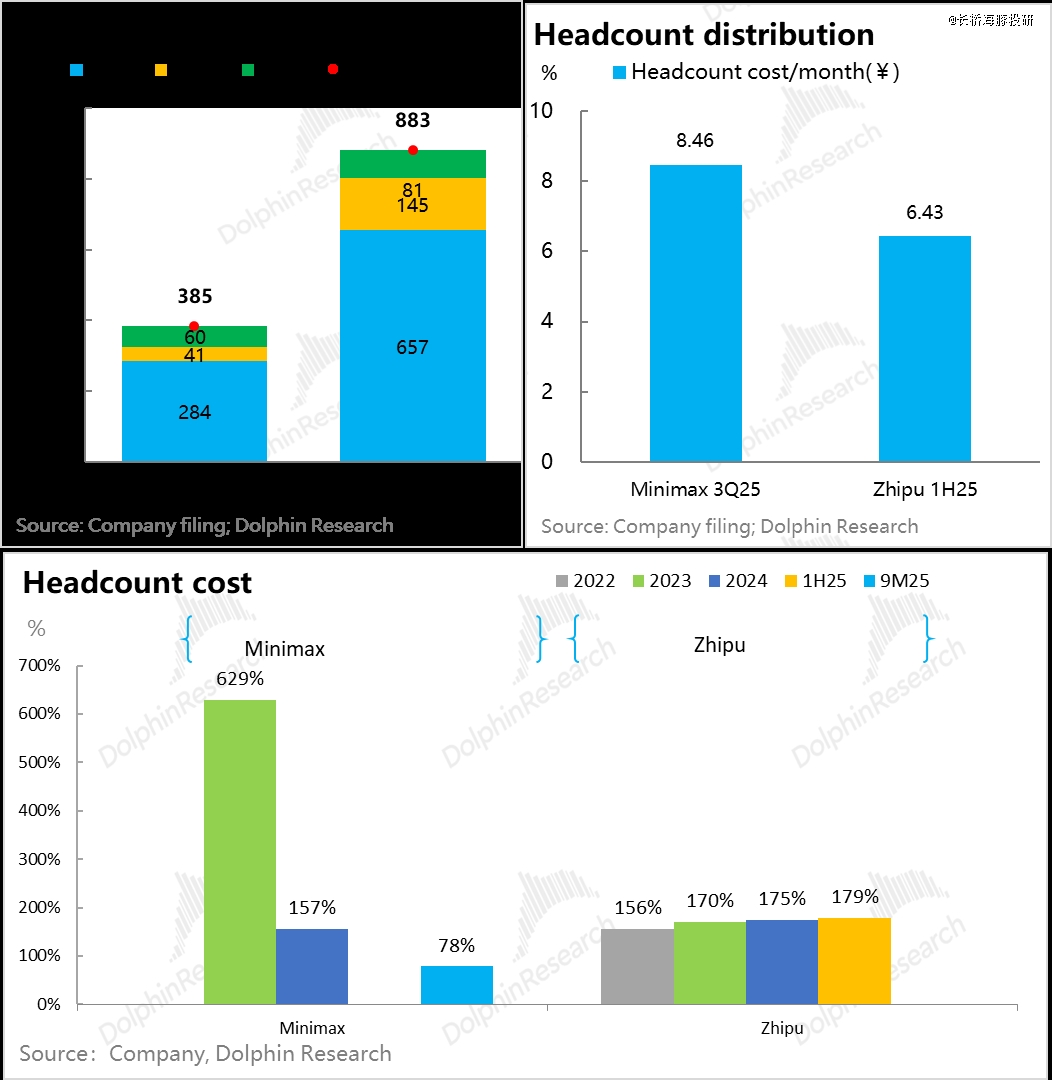 两个公司员工整体都没超1000人,尤其是Minimax都不足400人;两家公司研发人员都接近75%,单人头月成本6.5-8.5万元人民币(不含期权激励),其中Minimax研发人员单人月成本是16万。