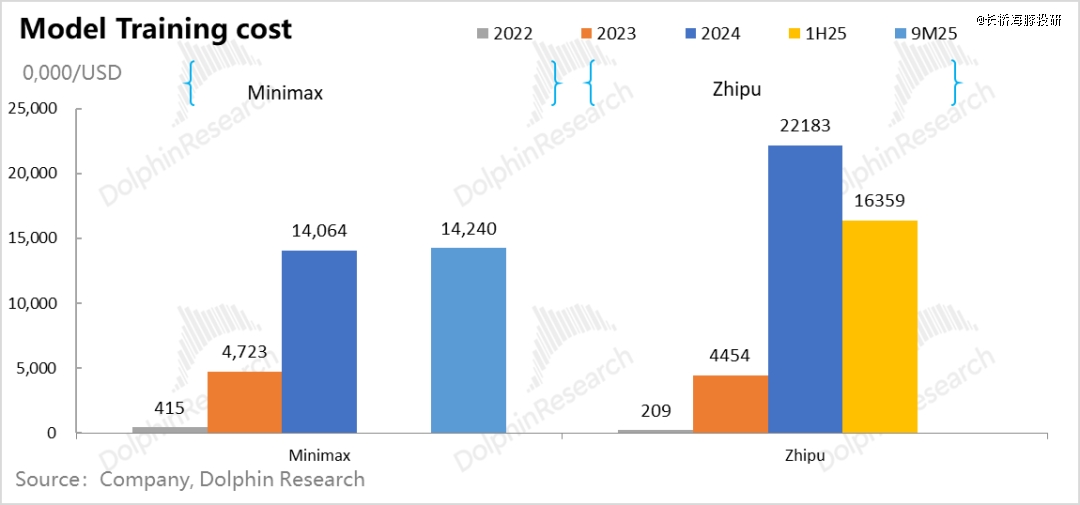 2024年两个公司的支出(成本与运营开支)加总基本在当期收入的10倍上下。Minimax 2025年前九个月收入快速做大后支出仍然是收入的5倍以上;而智谱到了2025年上半年看起来反而更加规模不经济了。
