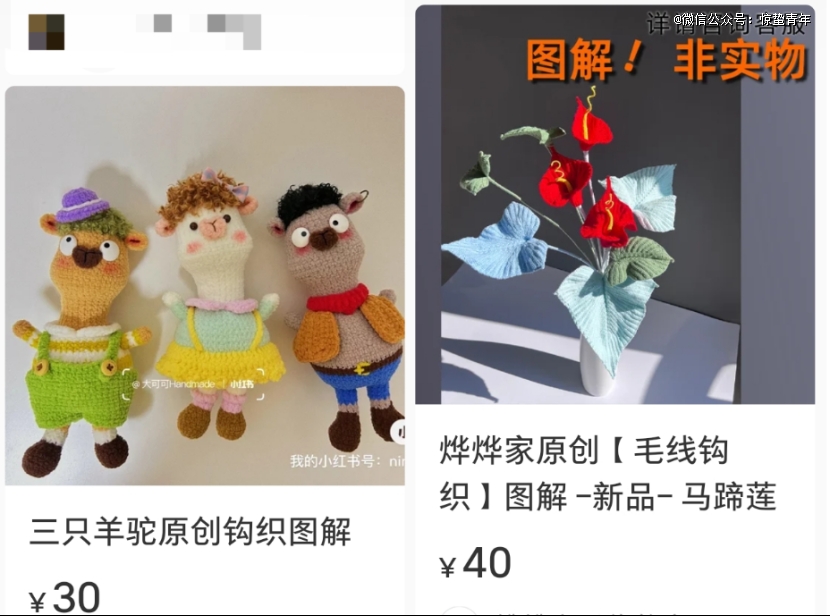 年轻人群体中不断上涨的钩织热,带火了一些让人意想不到的新兴生意,比如售卖原创钩织与针织图纸,根据设计难度,价格从几元到几十元不等。