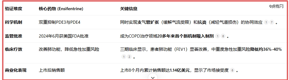 值得注意的是,PDE3/4作为一个治疗慢性阻塞性肺病(COPD)的靶点,能同时实现支气管扩张和抗炎的效果,直击COPD的核心病理机制。且2024年,美国FDA批准了同类首 款药物Ensifentrine,为该靶点的成药性提供了关键验证。
