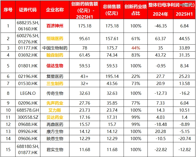 在2025年上半年国内创新药企业的激烈角逐中,百济神州不仅有全球爆款产品百悦泽(泽布替尼),更是以175亿元的创新药总收入独占鳌头,稳居榜首之位。