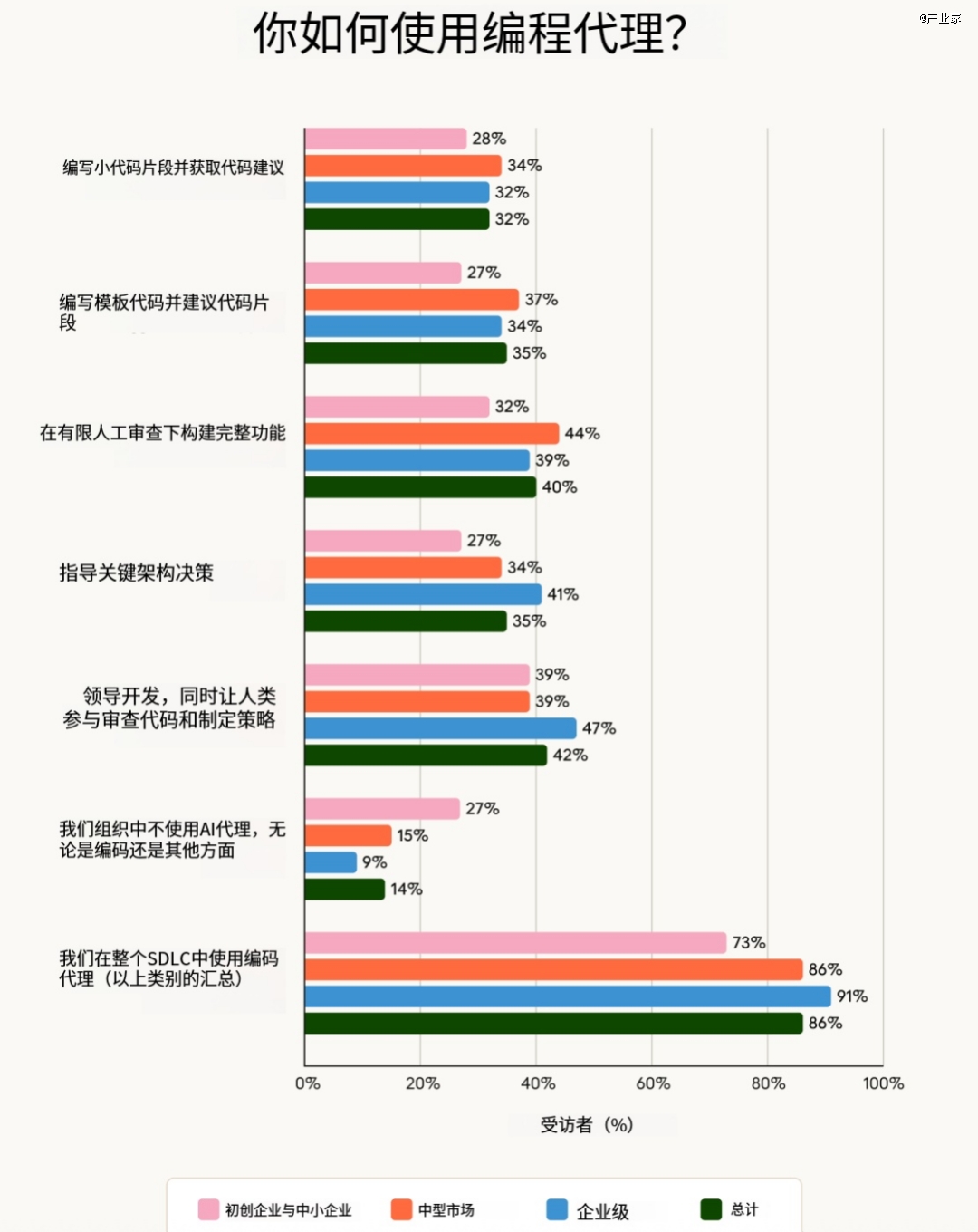 如今,超过九成的组织都在使用人工智能辅助编程。绝大多数(86%)的组织已经不再局限于试验阶段,而是将人工智能编程智能体用于生产代码的开发,其中企业的采用率领 先,达到 91%,而中小型企业的这一比例为 83%。42% 的组织信任这些智能体在人类的监督下主导开发工作,这标志着工程团队的结构以及代码的编写方式正在发生重大转变。