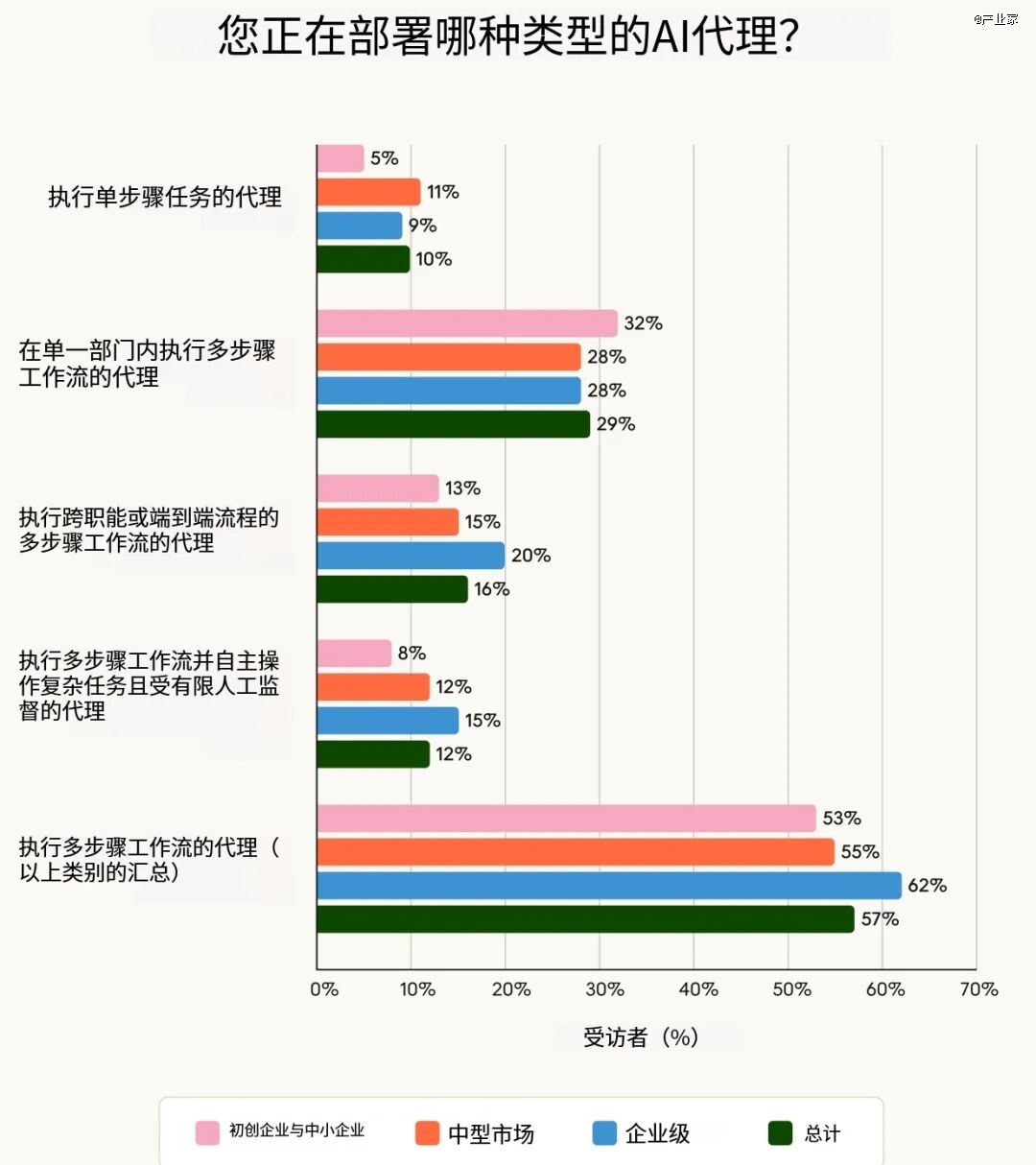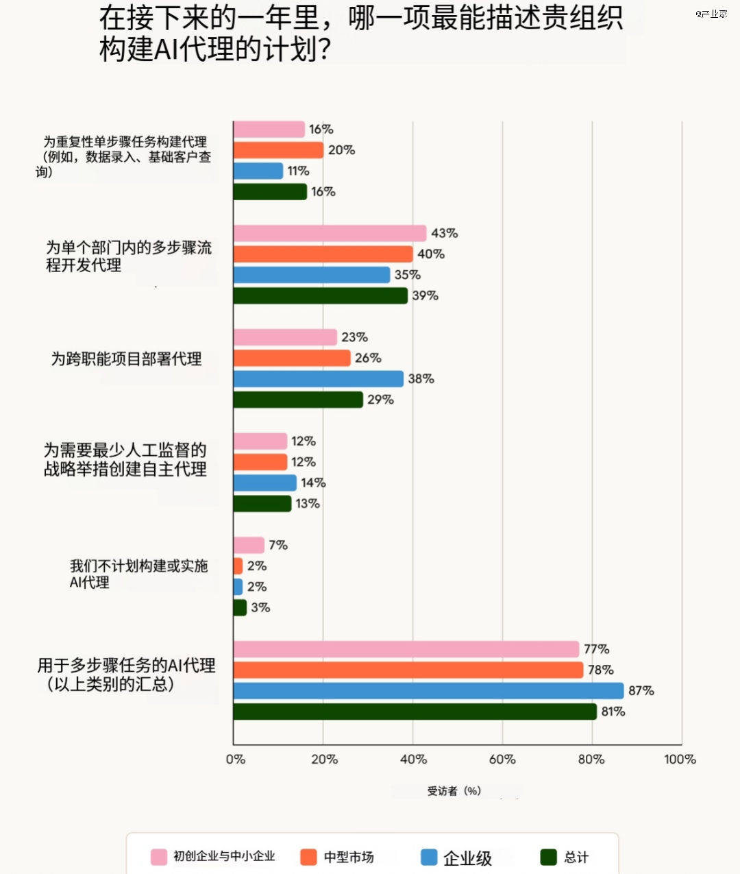 大多数组织(81%)计划在 2026 年从简单的任务自动化转向更复杂的人工智能项目,其中企业在这一转变中处于领 先地位,占比 87%,而中小企业为 78%。至于 “更复杂” 具体意味着什么:39% 的组织期望开发能够处理多步骤流程的智能体,29% 的组织计划部署智能体用于跨多个团队或部门的跨职能项目。