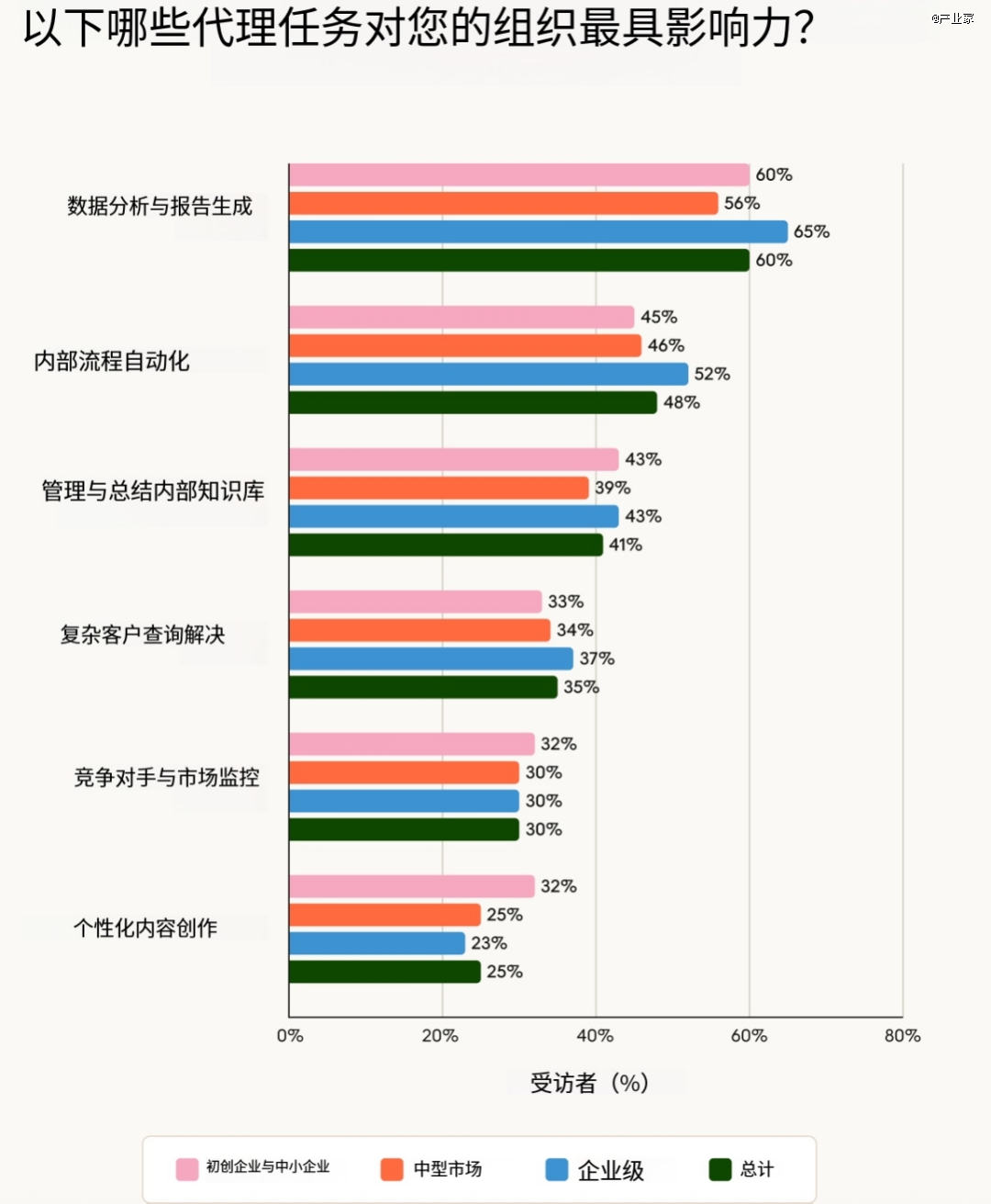 除了编码之外,影响最 大的人工智能智能体用例是数据分析和报告生成(60% 的人表示这是最 具影响力的任务之一)以及内部流程自动化(48%)。企业对数据分析和报告生成尤为看好,65% 的企业认为这些是高影响力的应用。