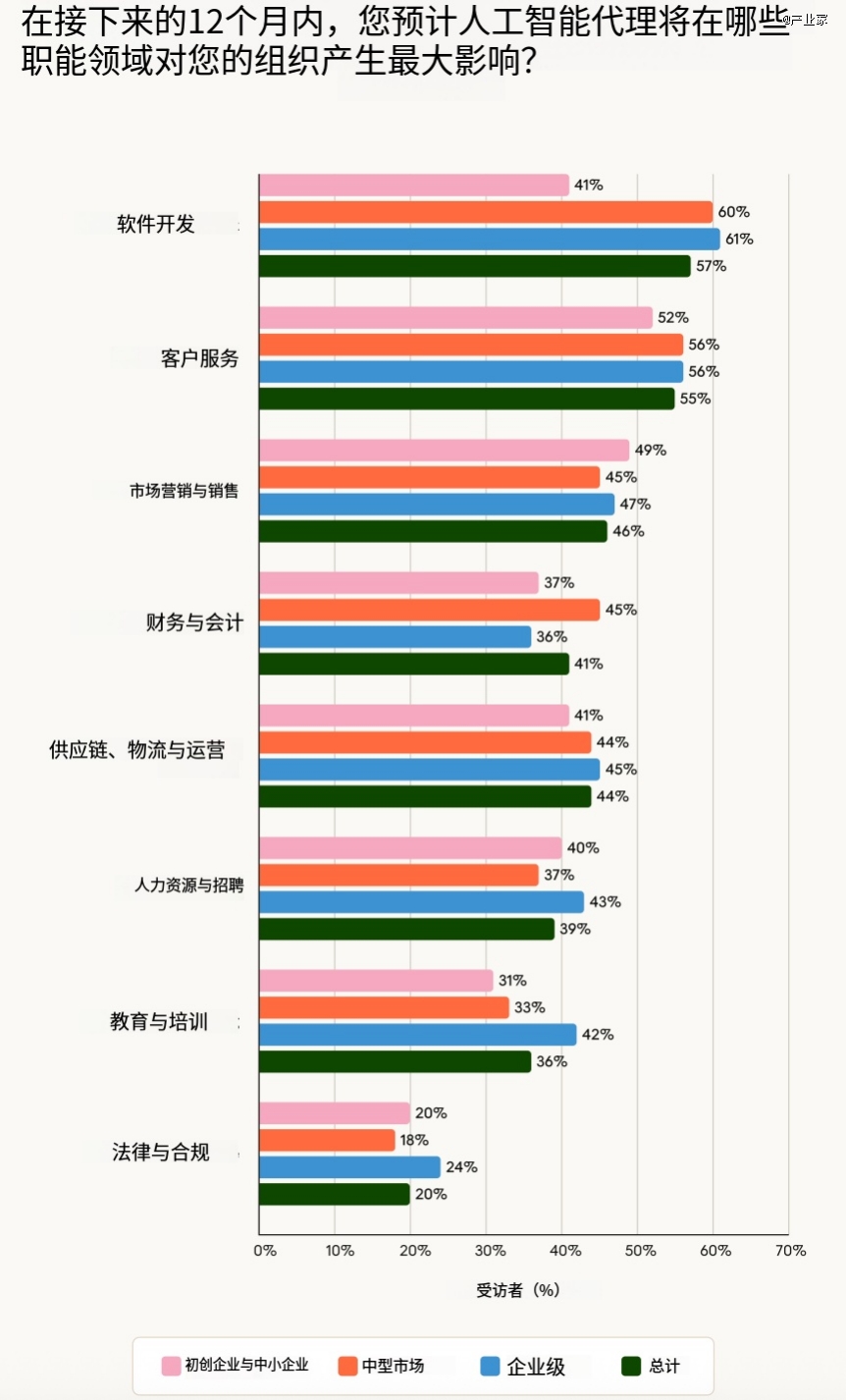 2026 年,软件开发(57%)和客户服务(55%)预计将在短期内受到 AI 智能体的最 大影响,紧随其后的是市场营销与销售(46%)以及供应链、物流和运营(44%)。
