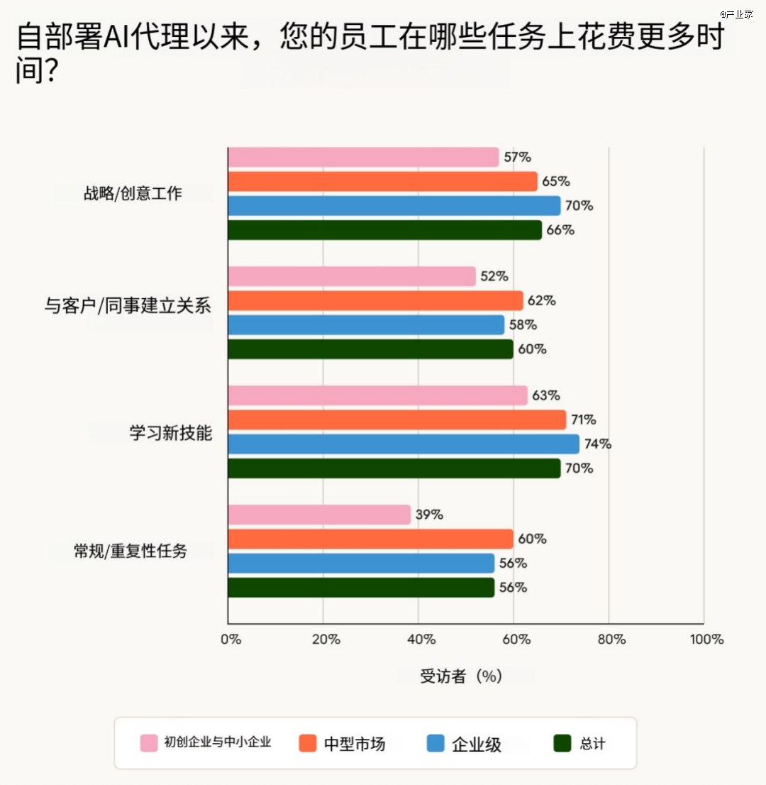 智能体正在改变员工的时间分配方式 —— 更多地关注战略工作(66%)、人际关系建设(60%)和技能发展(70%),而非日常执行。