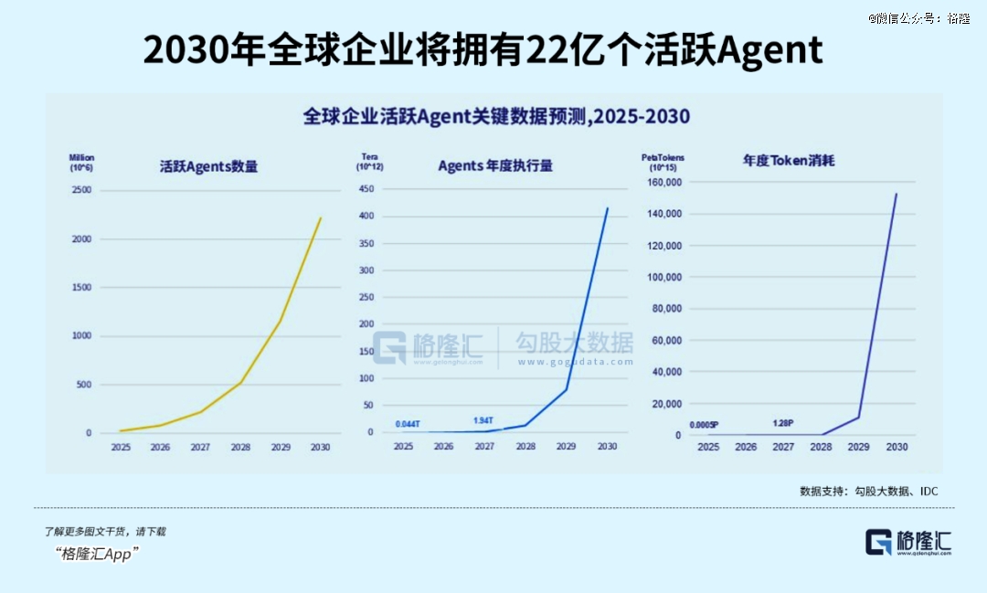 根据IDC预测,2025年到2030年,全球活跃Agent数量将从2860万暴涨至22.16亿,年复合增长率高达139%;年度任务执行量将从440亿次飙升至415万亿次,年复合增长率524%;而Token消耗量的年复合增长率更是达到惊人的3418%。
