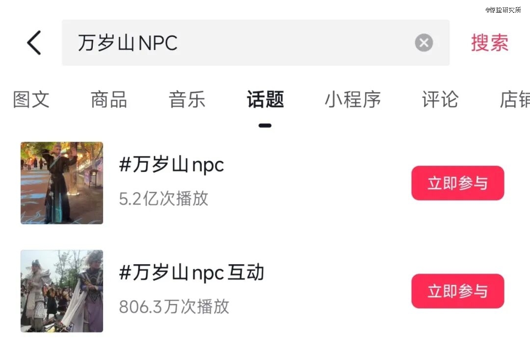 在抖音平台上,仅“万岁山npc”单个话题的播放量就超过5.2亿次,“天津欢乐谷npc”话题的播放量更是高达8.8亿次。并且景区的NPC不仅数量多,类型也呈现出多样化的特点。