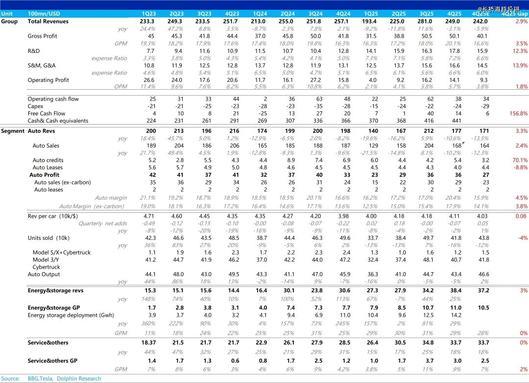 3、核心卖车毛利率(去碳积分)环比也在回升:本季度核心的卖车毛利率(去碳积分)环比从上季度15.4%回升到本季度17.9%,与市场预期的销量差从而卖车毛利率恶化的预想不一致,单车可变成本的下行(可能由于美国政策补贴影响),对冲了单价下滑,规模效应释放受阻,以及受关税负面影响加大等负面影响,最后卖车毛利率反而在环比上行。