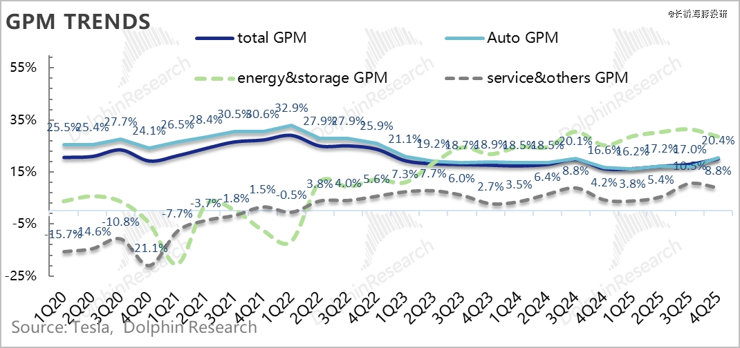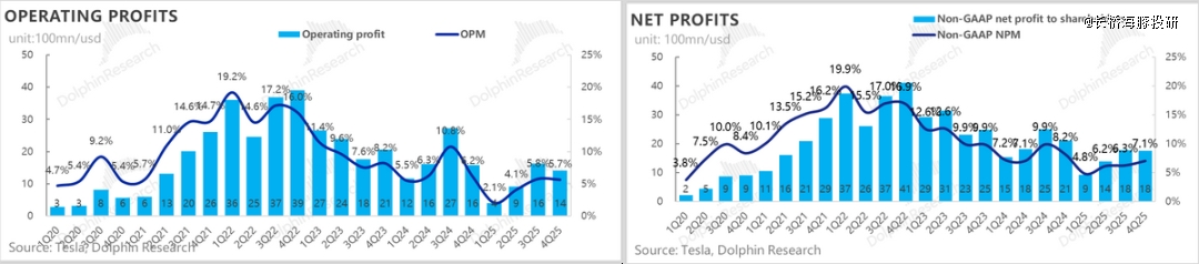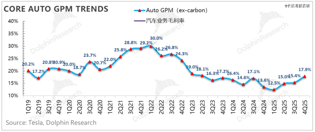最终,虽然规模效应释放受阻,以及受关税负面影响加大,但可能由于美国政策补贴影响,特斯拉四季度的单车卖车成本反而在下滑,也带动了四季度卖车毛利率环比继续上行2.5个百分点至17.9%(去碳积分)。
