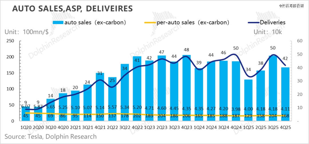 但在市场最关心的真实汽车销售收入(去碳积分和租赁收入)来看,本季度汽车销售168亿,超出市场预期164亿,主要由于卖车单价下滑幅度好于市场预期。