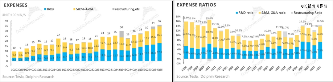 4、研发费用+资本开支的狂投都仍然在为AI的星辰大海业务买单:特斯拉本季度研发开支和销售费用又在继续加大,研发费用17.8亿,高于市场预期15.9亿,仍然由于AI智能化投入的继续加大,以及研发费用主要用于HW5.0芯片,Robotaxi和Optimus的投入,特斯拉指引研发费用支出在未来还会继续加大。