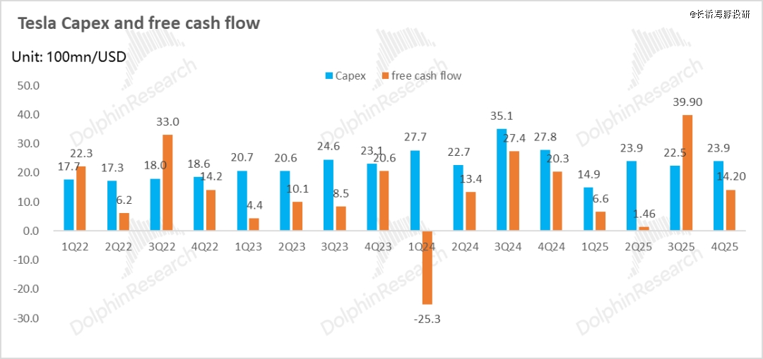 而在自由现金流方面,本季度运营现金流由于存货的增加,环比下行24亿至38亿,而资本开支上仍然还在为AI业务继续投入,本季度资本开支24亿(全年资本开支略低于特斯拉之前给的2025年90亿的指引),特斯拉的cortex训练集群已经在四季度超过了10万块等效H100的算力水平。