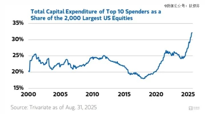 一旦对大规模训练的长期需求无法精准预估,那么之前为数据中心投入的风险也将成倍而来。摩根士丹利数据显示,2025年美国AI数据中心相关资本开支增长了四倍,已接近4000亿美元级别,集中在少数巨头身上,且结构高度单一。
