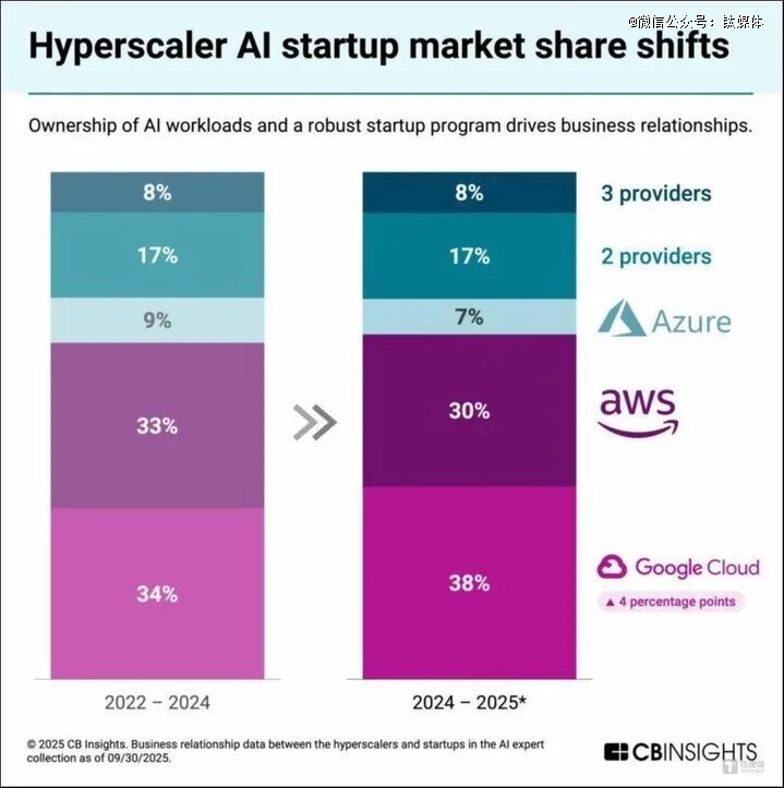 CBIsights 研究判断, 2024-2025年期间,与此前三年(2022-2024)会有明显格局上的增量变化:其中,谷歌云的占比将提高4%。目前约有25%的AI软件采用多云架构。
