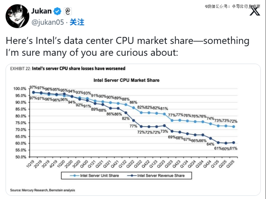 如今,英特尔的垄断格局已被彻底改写,数据与市场表现均印证了英特尔的式微。据Mercury Research近日披露的数据显示,英特尔的市场份额在八年内从大约从90%下降到60%。