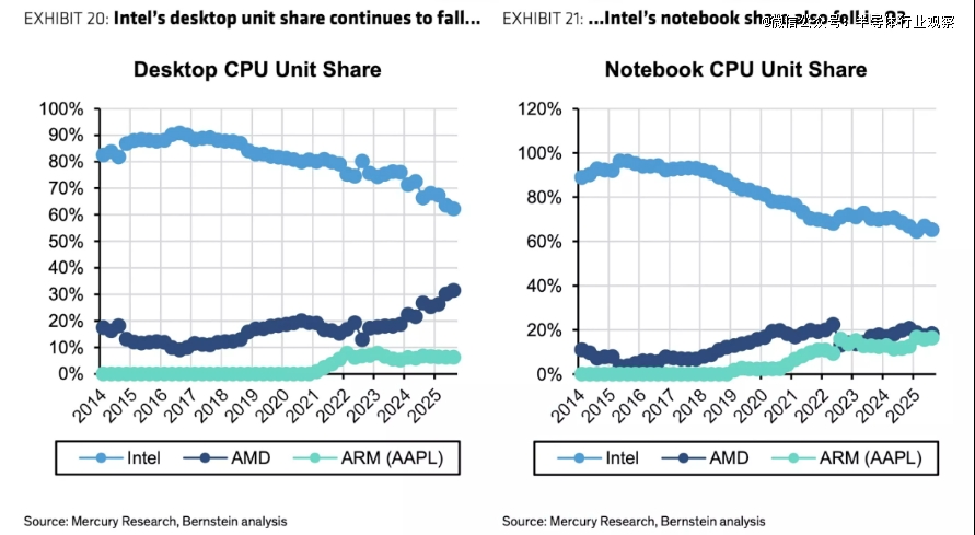 Bernstein Research指出,苹果笔记本电脑CPU的市场份额已达到约20%,与AMD持平。自2018年以来,这两家公司合计已将英特尔的市场份额拉低了20%以上。台式机领域的情况也类似,尽管AMD在该领域的影响力远超苹果。