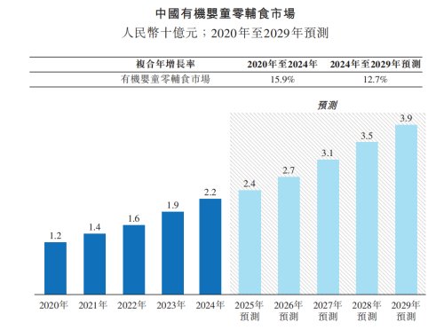 据弗若斯特沙利文测算,中国婴童零辅食渗透率已从2020年的36.8%提升至2024年的43.3%,预计2029年将进一步升至52.2%;市场规模从2020年的317亿元增长至2024年的394亿元,复合年增长率达5.6%。其中有机婴童零辅食赛道表现更为突出,2020-2024年市场规模从12亿元增至22亿元,复合年增长率达15.9%,预计2029年市场规模将进一步扩大至39亿元。