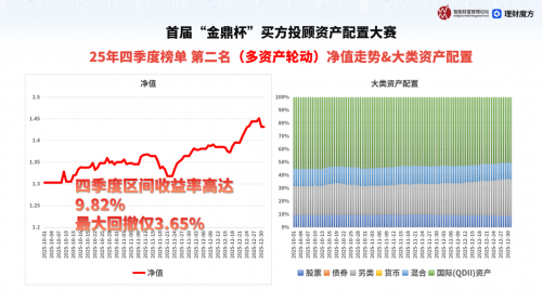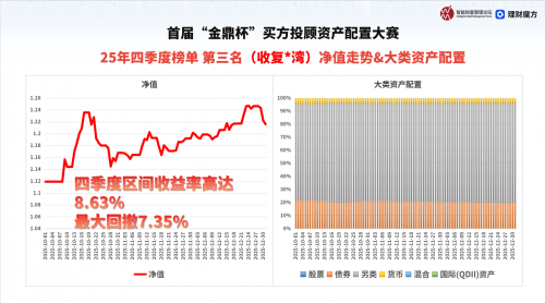 季榜前三名脱颖而出,成绩尤为突出。冠军“愚公必移山”参赛组合不仅实现10.04%的高收益率,*回撤仅5.59%,展现了“高收益+低风险”的优质特性。其资产配置灵活多元,股票、另类、混合及国际(QDII)资产合理搭配,在市场波动中精准把握机会,净值持续稳步攀升。亚军“多资产轮动”参赛组合以9.82%的收益率紧随其后,*回撤低至3.65%,风险控制能力堪称典范,凭借对多类资产的动态轮动配置,在震荡市场中保持了稳健增长。季军“收复*湾”参赛组合四季度收益率达8.63%,尽管*回撤为7.35%,但通过聚焦债券与另类资产的核心配置,实现了可观的投资回报。