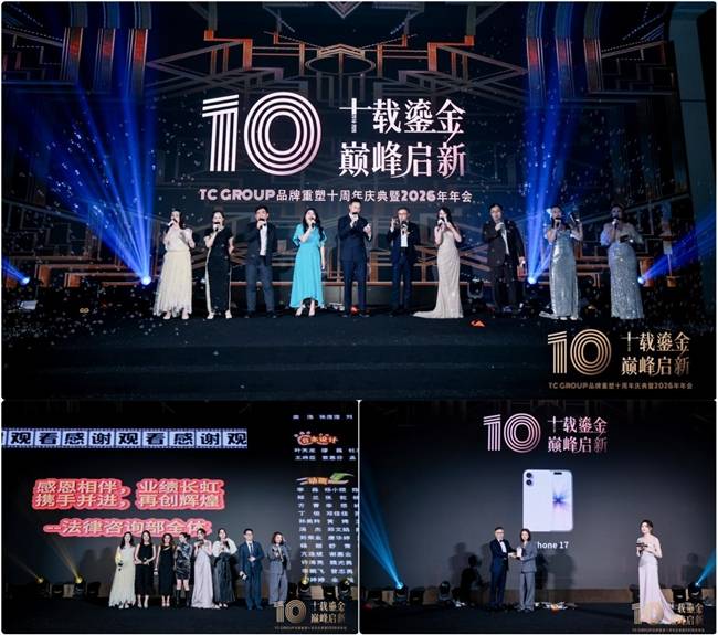 2026年1月18日,以“十载鎏金、*启新”为主题的TC GROUP品牌重塑十周年庆典暨2026年会在欢腾与感动中隆重举行。来自TC GROUP美国、新加坡、中国香港、北京、上海、南京、苏州、无锡、成都、厦门、合肥等11个机构的杰出代表齐聚一堂,共同回顾奋斗历程,见证荣耀时刻,开启崭新征程。