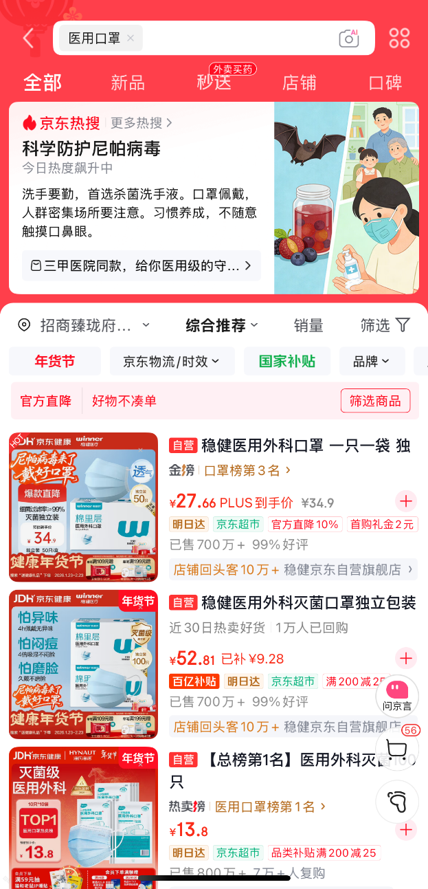 京东健康数据显示,近一周来,N95口罩、医用消毒酒精等防护用品的搜索量环比增长2倍,反映出消费者对健康防护的主动关注。京东健康医疗器械相关品类负责人表示,已密切关注境外疫情动态,持续进行风险评估与应急准备,目前各类防护物资供应充足、价格平稳,可满足民众日常防护与应急需求。