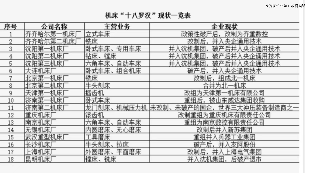 新中国机床产业的发展始于“一五”期间,可以说是最早被重视与支持的产业。在百废待兴的当时,就由其时的一机部二局(机床局)直辖统御,构建了一个由18家重点国企(“十八罗汉”)、8家科研院所(“七院一所”)组成的机床工业体系。