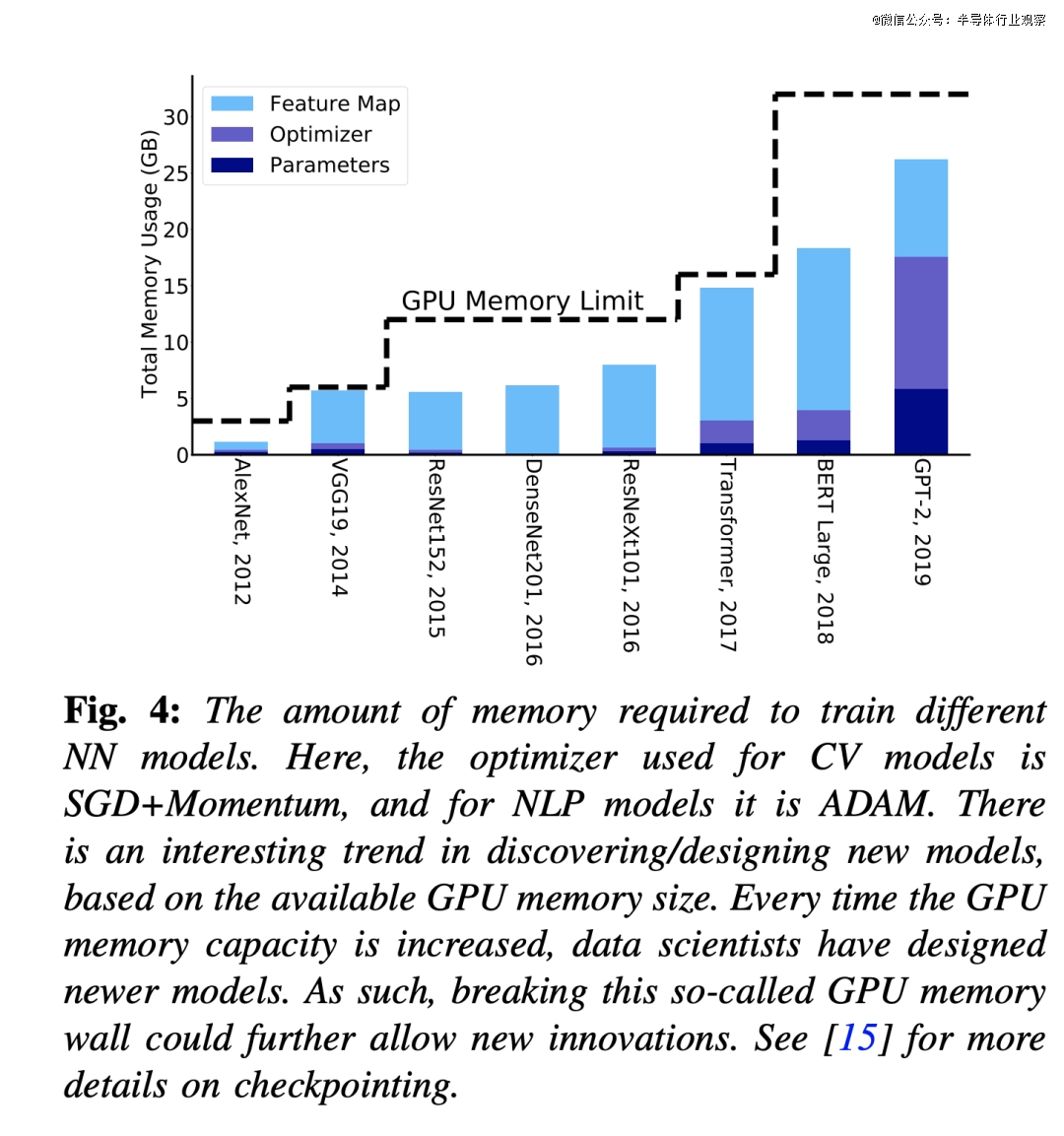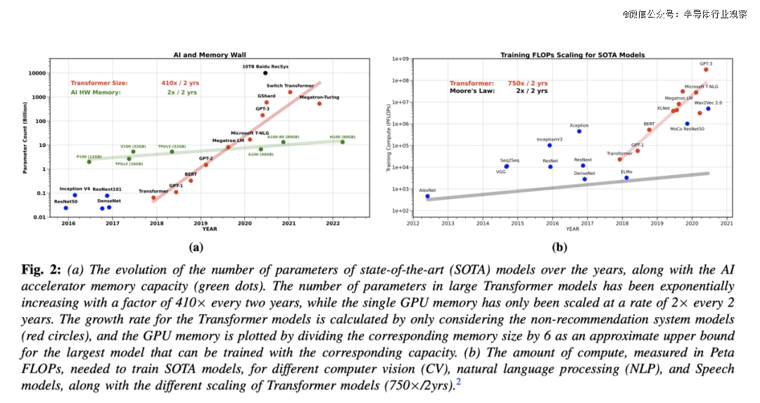 在这项工作中,我们通过研究更新的数据重新审视了这一趋势,尤其关注用于训练人工智能模型的硬件,以及用于训练/运行这些模型的计算特性。30 年过去了,上述观察和预测依然完全正确。尽管内存技术取得了诸多创新,但趋势表明,“内存墙”正日益成为一系列人工智能任务的主要瓶颈。
