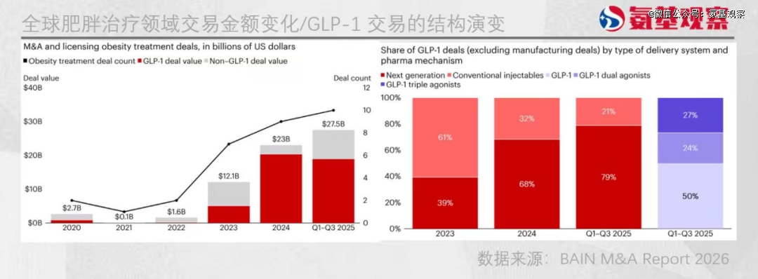 而进入2026年,减重药仍将占据并购交易价值的重要份额。但不同于第 一波以“快速上市”为核心目标的新药争夺,新一轮并购更聚焦于下一代给药平台、口服制剂、小分子、新靶点以及GLP-1多激动剂分子的布局。
