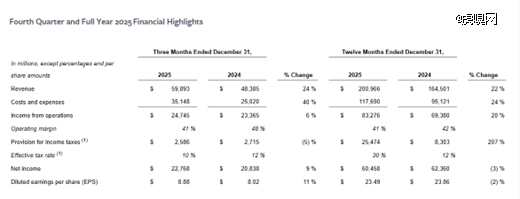 1月28日,Meta公布了2025财年第四财季的业绩。财报显示,Meta在第四财季Meta营收598.93美元,较去年同期增长24%;净利润为227.68亿美元,同比增长9%;摊薄后每股收益8.88美元,高于市场预期的8.23美元。
