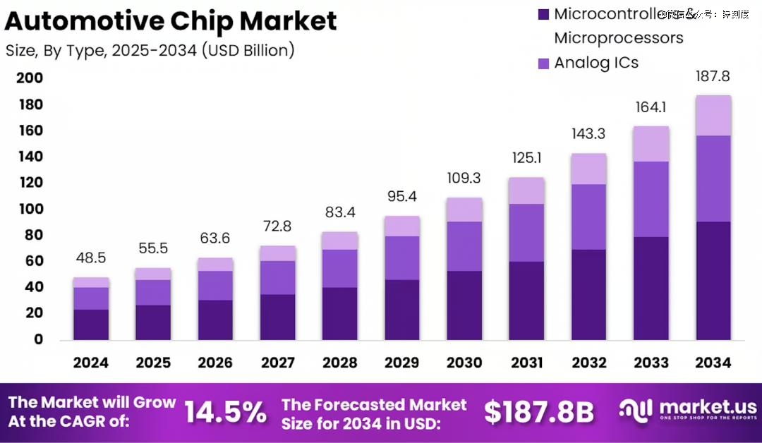 Market.us的报告显示,全球汽车芯片市场预计将从2024年的485亿美元增长至2034年的1878亿美元,年复合增长率高达14.5%,这一增长主要来源于汽车电气化、自动化和车联网的加速演进。