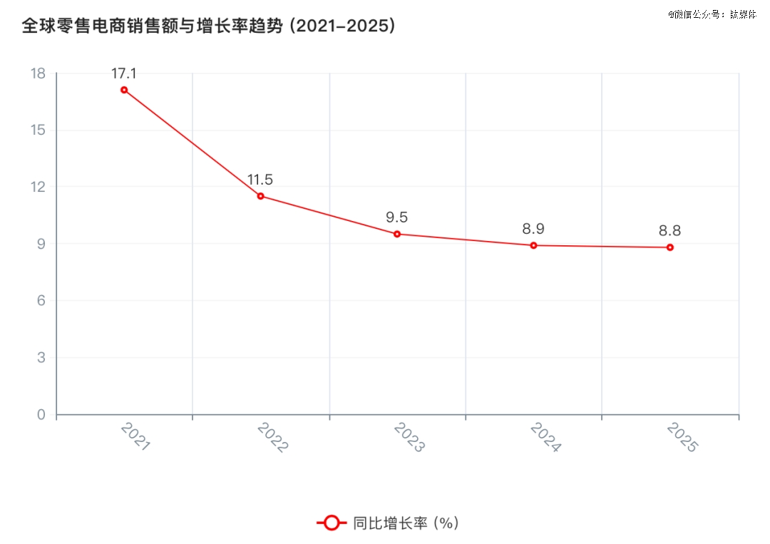 从2021年高达17.1%的全球线上化狂欢,2023年首次跌破10%的标志性转折,2025年稳定在8.8%的个位数新常态,不难看出,那个仅靠市场水涨船高就能轻松增长的时代,已经一去不复返。