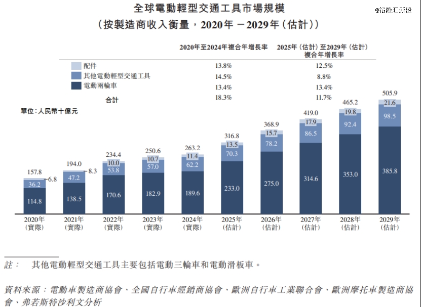 市场规模方面,据弗若斯特沙利文的数据,2024年全球电动轻型交通工具制造商总收入为2632亿元,预计到2029年将达到5059亿元,2025年至2029年的复合年增长率预计约11.7%,低于2020年至2024年18.3%的复合年增长率。